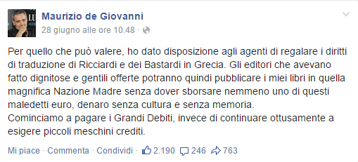 “Per quello che può valere – scrive de Giovanni – ho dato disposizione agli agenti di regalare i diritti di traduzione di Ricciardi e dei Bastardi in Grecia. Gli editori che avevano fatto dignitose e gentili offerte potranno quindi pubblicare i miei libri in quella magnifica Nazione Madre senza dover sborsare nemmeno uno di questi maledetti euro, denaro senza cultura e senza memoria. Cominciamo a pagare i Grandi Debiti, invece di continuare ottusamente a esigere piccoli meschini crediti”.