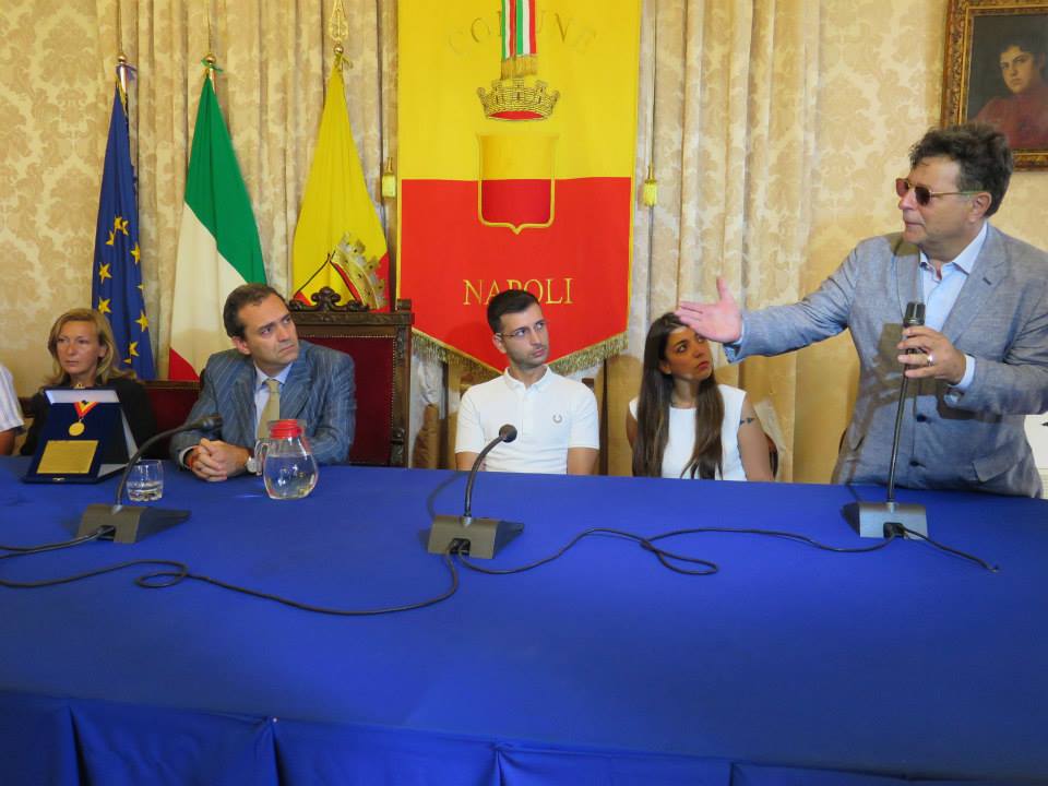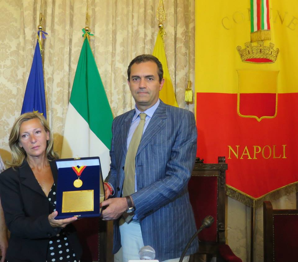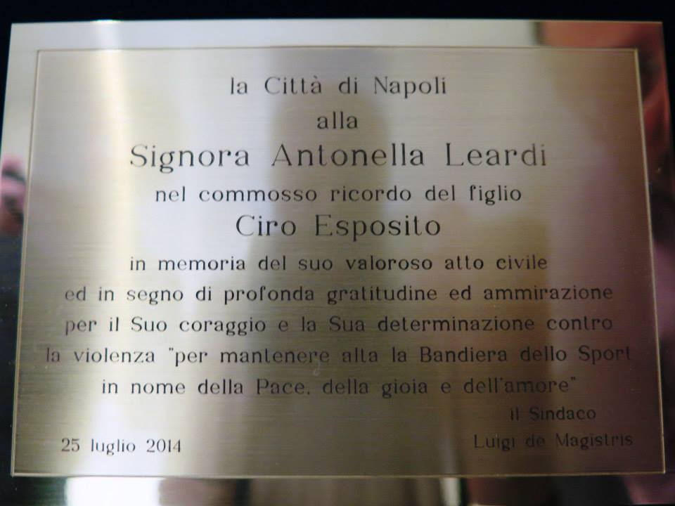 Luigi de Magistris ha consegnato, questa mattina a Palazzo San Giacomo, la medaglia d’oro della città di Napoli ad Antonella Leardi, la mamma di Ciro Esposito, il tifoso del Napoli che, come sappiamo, ha perso la vita dopo essere stato ferito con un colpo di arma da fuoco al petto a Roma prima della finale di Coppa Italia Napoli-Fiorentina lo scorso 3 maggio. Alla cerimonia, oltre alla madre del giovane, erano presenti anche lo zio, il padre, il fratello e la fidanzata di Ciro. Le motivazioni del conferimento della medaglia sono state date dal comportamento esemplare della donna che “se avesse usato altre parole avrebbe potuto innescare una spirale di violenza“, dice il sindaco.