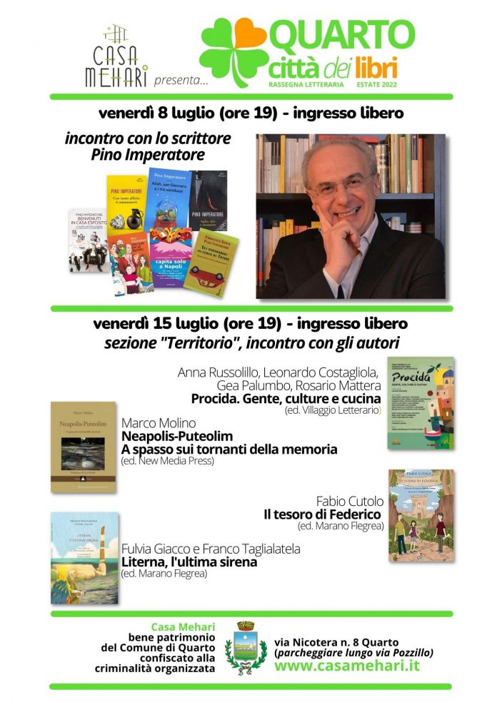 Prende il via la Rassegna letteraria “Quarto città dei libri” – Estate 2022 organizzata a Casa Mehari, bene proprietà del comune di Quarto confiscato alla criminalità organizzata. La struttura è in via Nicotera n°8 a Quarto, Napoli. La struttura, inaugurata lo scorso 20 maggio, è dedicata a Giancarlo Siani, giornalista del quotidiano “Il Mattino”; Mehari è il nome del modello dell’auto Citroën su cui il giovane venne ucciso dalla camorra il 23 settembre del 1985.