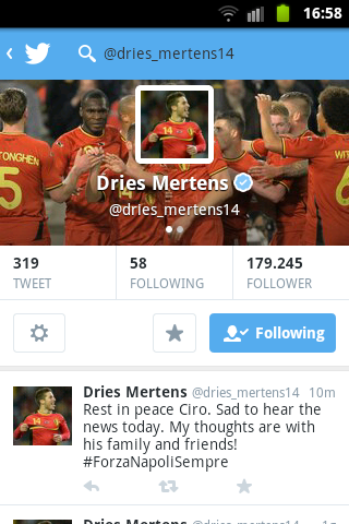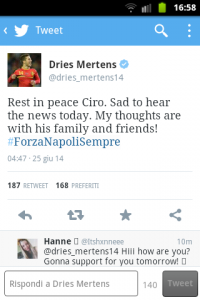 Non solo media, non solo giornalisti: anche i calciatori mostrano cordoglio alla famiglia di Ciro Esposito, scomparso questa mattina dopo i tristi avvenimenti di Roma. Il centrocampista del Napoli e della Nazionale belga Dries Mertens, ha voluto mostrare il proprio dolore per il tragico evento, lasciando un post su Twitter.