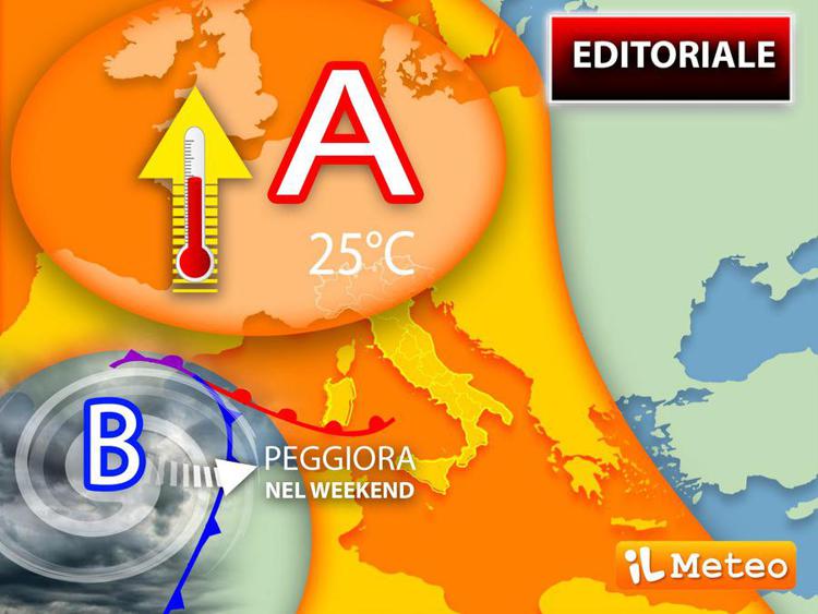 Sulla carta sinottica europea spicca l’anticiclone denominato ‘Norreno’ con una configurazione molto netta ed estesa ad Omega: come la forma della lettera greca suggerisce, avremo una grossa alta pressione al Centro e due basse pressioni ai lati, ad Ovest un ciclone continuerà a spingere piogge verso la Spagna, ad Est il maltempo imperverserà in Turchia.