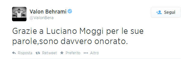 Belle parole di stima, che non hanno lasciato indifferente lo stesso giocatore che attraverso Twitter ha voluto ringraziare Moggi: “Grazie a Luciano Moggi per le sue parole,sono davvero onorato”.