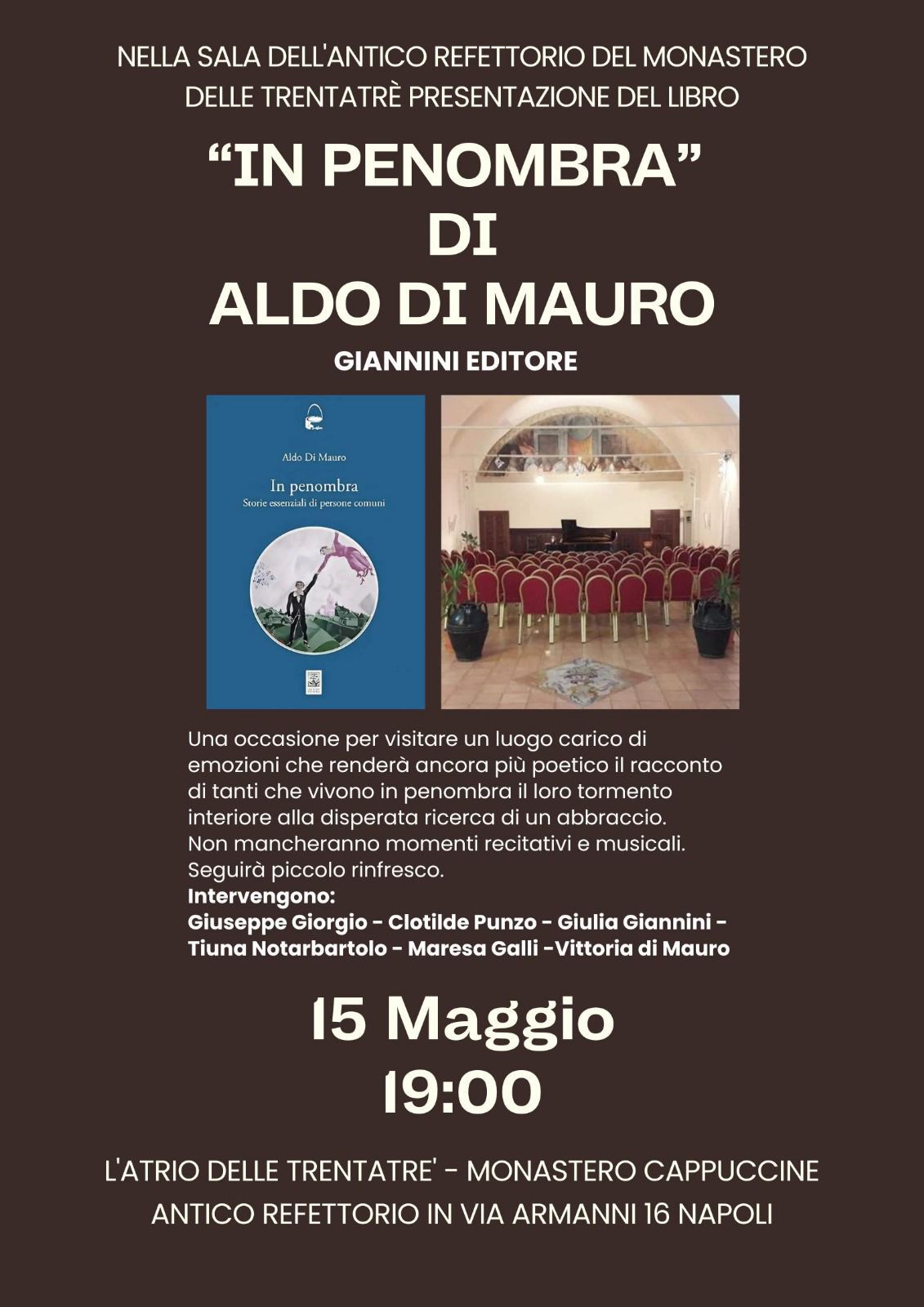 Ritorna in un luogo carico di magia lo scrittore Aldo Di Mauro che presenterà il suo libro “In Penombra” nella sala dell’antico refettorio delle Trentatrè, Monastero Cappuccine, via Armanni 16 Napoli. Pubblicato dalla Giannini Editore, nella collana Cisterna, l’appuntamento per la presentazione è prevista per giovedì 15 maggio alle ore 19. Interverranno: Giuseppe Giorgio, Clotilde Punzo, Giulia Giannini, Tiuna Notarbartolo, Maresa Galli e Vittoria Di Mauro.