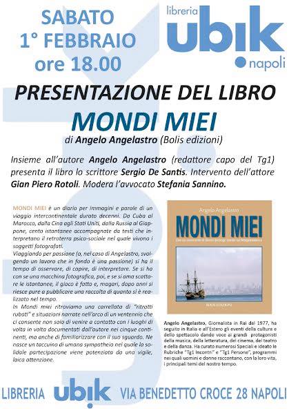 Sabato, 1 febbraio, alle ore 18.00, presso la libreria Ubik di Napoli in via Benedetto Croce n. 28, lo scrittore Sergio De Santis e l’attore Gian Piero Rotoli, presenteranno “Mondi miei”, di Angelo Angelastro, Bolis Edizioni.