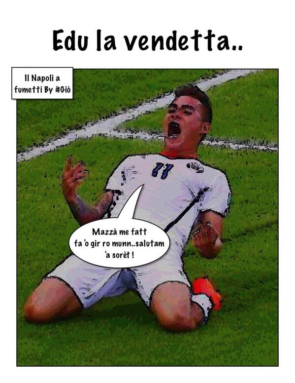 Il titolo della vignetta è “Edu la vendetta” ed al centro si legge la scherzosa frase del cileno dopo il gol realizzato: “Mazzà me fatt fa ‘o gir ro munn…salutam ‘a…”. Una satira divertente che farà ridere i tanti tifosi del Napoli.