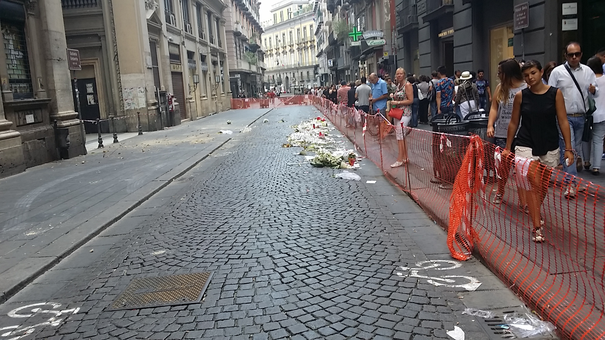 Napoli si stringe nel ricordo di Salvatore Giordano. Nei pressi dell’entrata della Galleria Umberto, lì dove il giovane ha perso la vita in seguito alla caduta di alcuni calcinacci ed attualmente transennata per evitare il transito dei passanti, tantissime persone hanno depositato fiori, braccialetti e foto in ricordo della giovane vittima.