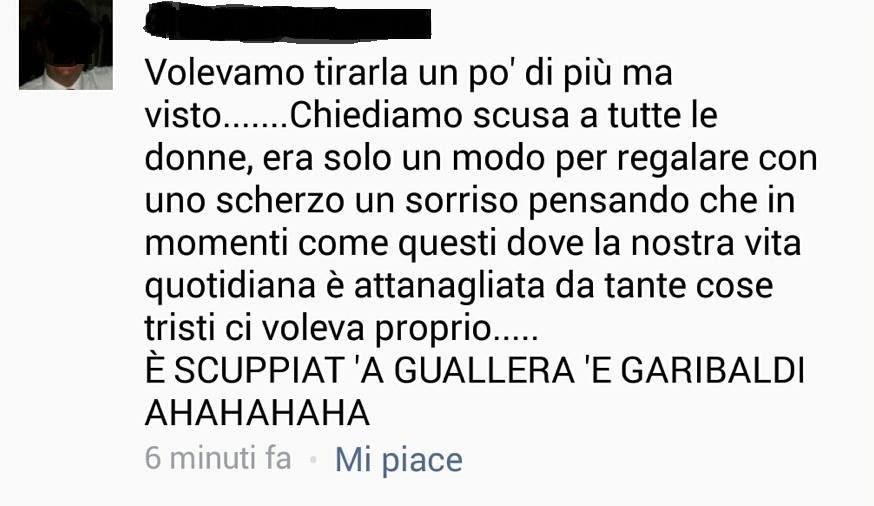 Uno scherzo di dubbio gusto che ha destato l’indignazione del popolo della rete. Che non ha gradito la burla, anzi. “Sei un emerito cretino”, “Sinceramente non riesco proprio a capire l’ironia”, “Sì proprio strunz!” i commenti successivi. Qualcuno si è arrabbiato al punto da segnalare il messaggio alla polizia postale. “Sai che quello che hai fatto è un reato?”. “Il tuo nominativo è stato segnalato alla polizia postale” commenta un altro utente, “ora vedi come ridi…”. Insomma, il pessimo scherzo rischia di trasformarsi per il suo autore in una denuncia penale per procurato allarme.