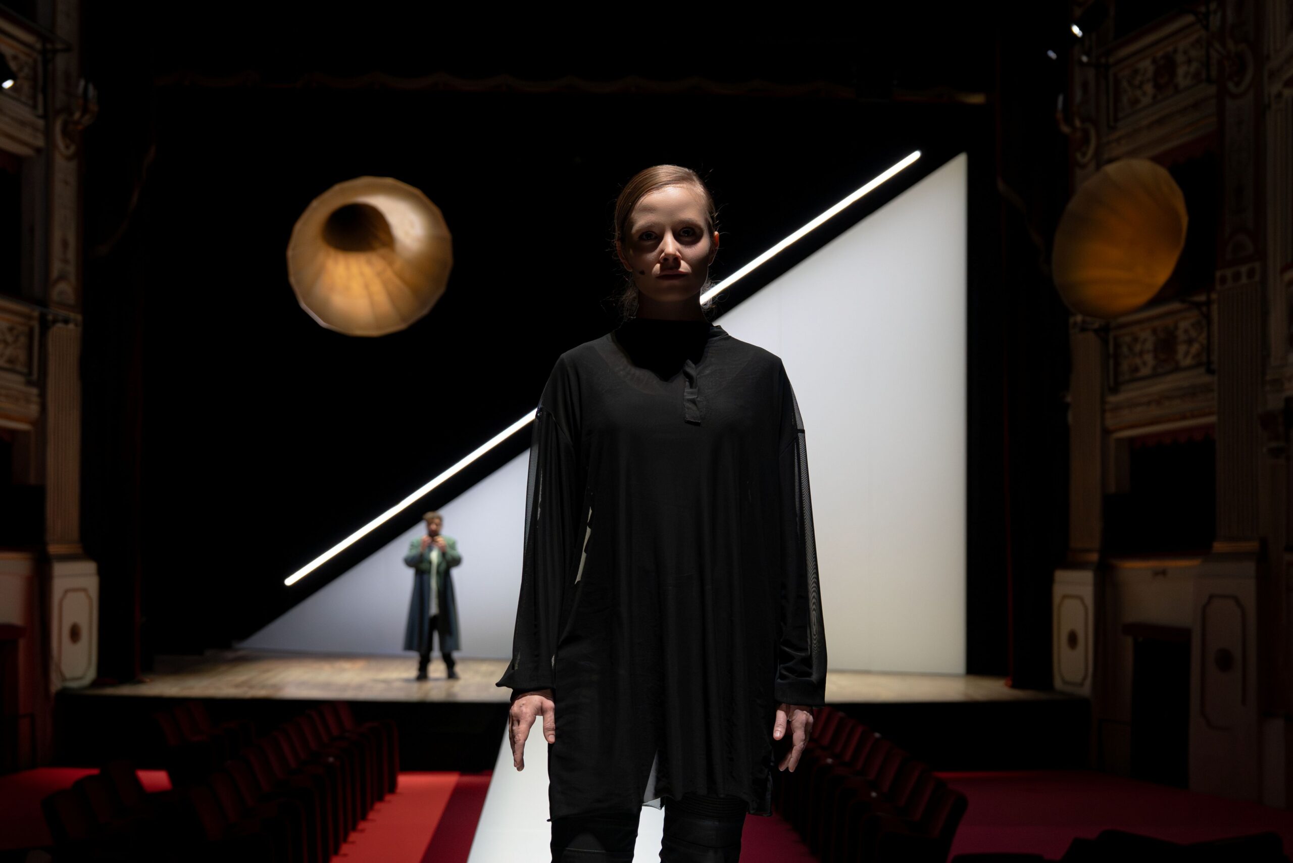 La regia di Ferracchiati propone un allestimento suggestivo che trasforma il processo in un’installazione vivente: il pubblico diventa parte di una giuria invisibile, osservando Giovanna come un “reperto” al centro della scena. Le voci dei santi e del giudice arrivano dai palchi come suoni evocativi, sottolineando l’isolamento della protagonista.