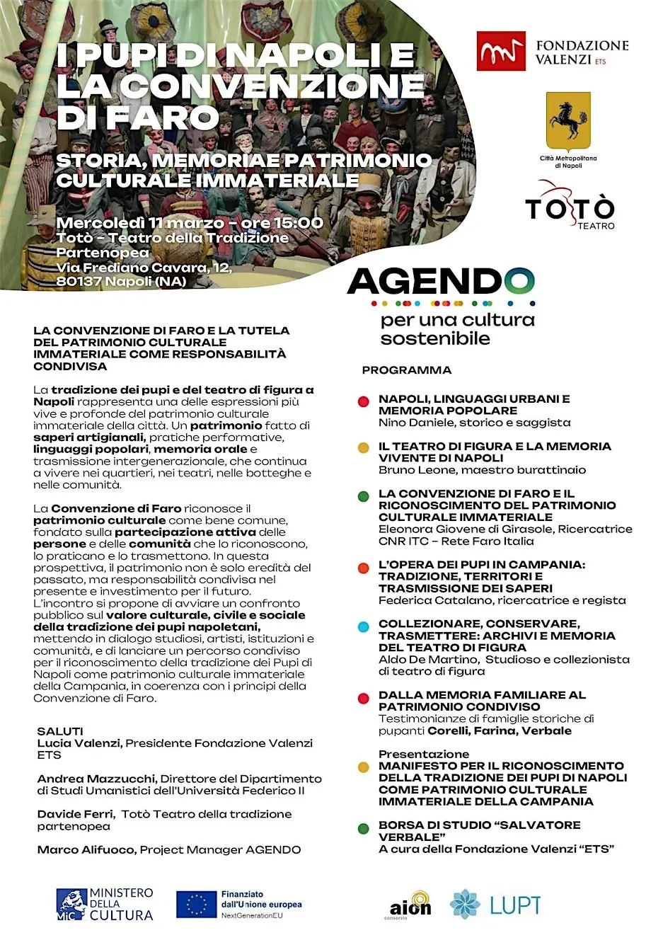Un pomeriggio di riflessione e memoria dedicato a una delle tradizioni più rappresentative della cultura popolare napoletana. Mercoledì 11 marzo alle ore 15 il Teatro Totò di Napoli, in via Frediano Cavara 12, ospiterà l’incontro dal titolo “I pupi di Napoli e la Convenzione di Faro. Storia, memoria e patrimonio culturale immateriale”.