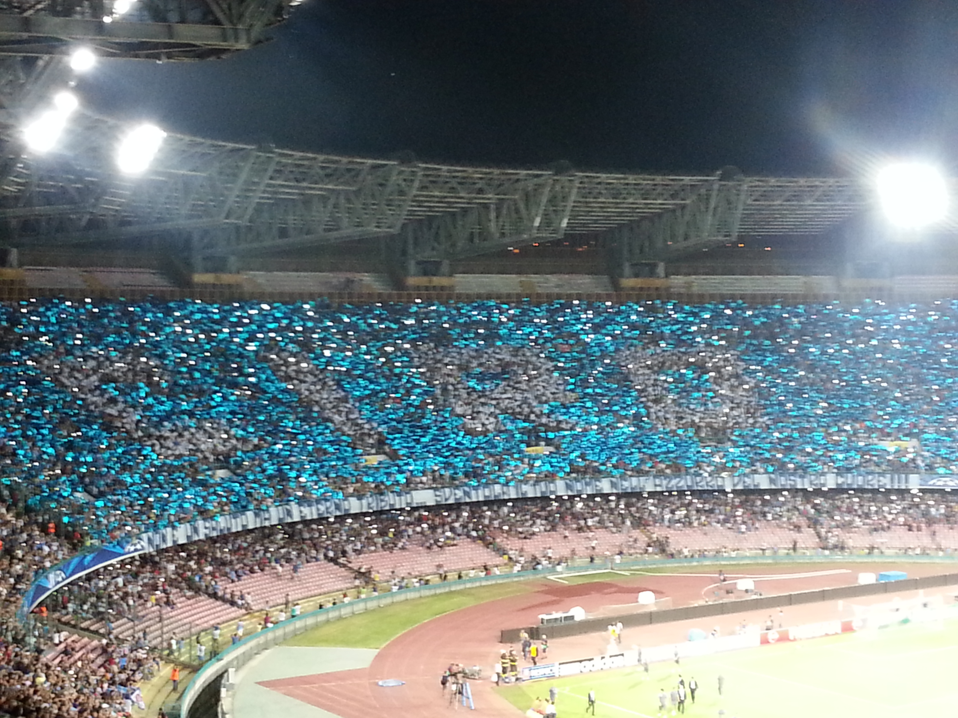 Nel prepartita di Napoli – Athletic Bilbao, durante l’esecuzione dell’inno della Champions, dalla curva B una splendida coreografia ed uno striscione per Ciro Esposito, vittima di un agguato in occasione dell’ultima finale di Coppa Italia: “Non è un saluto ma un eterno tributo..sventola il tuo nome nell’azzurro del nostro cuore!!!”