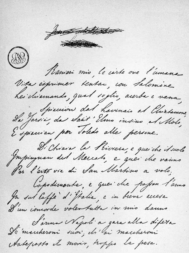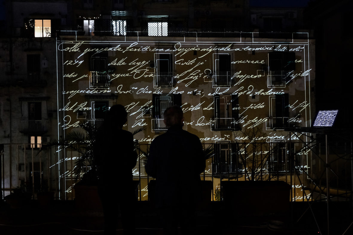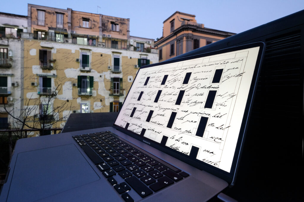 Poi, sulla facciata del palazzo, comparirà in lenta progressione la proiezione luminosa del manoscritto ‘I nuovi credenti’, canto satirico e toponomastico composto da Leopardi proprio durante il soggiorno nella casa di vico Pero.