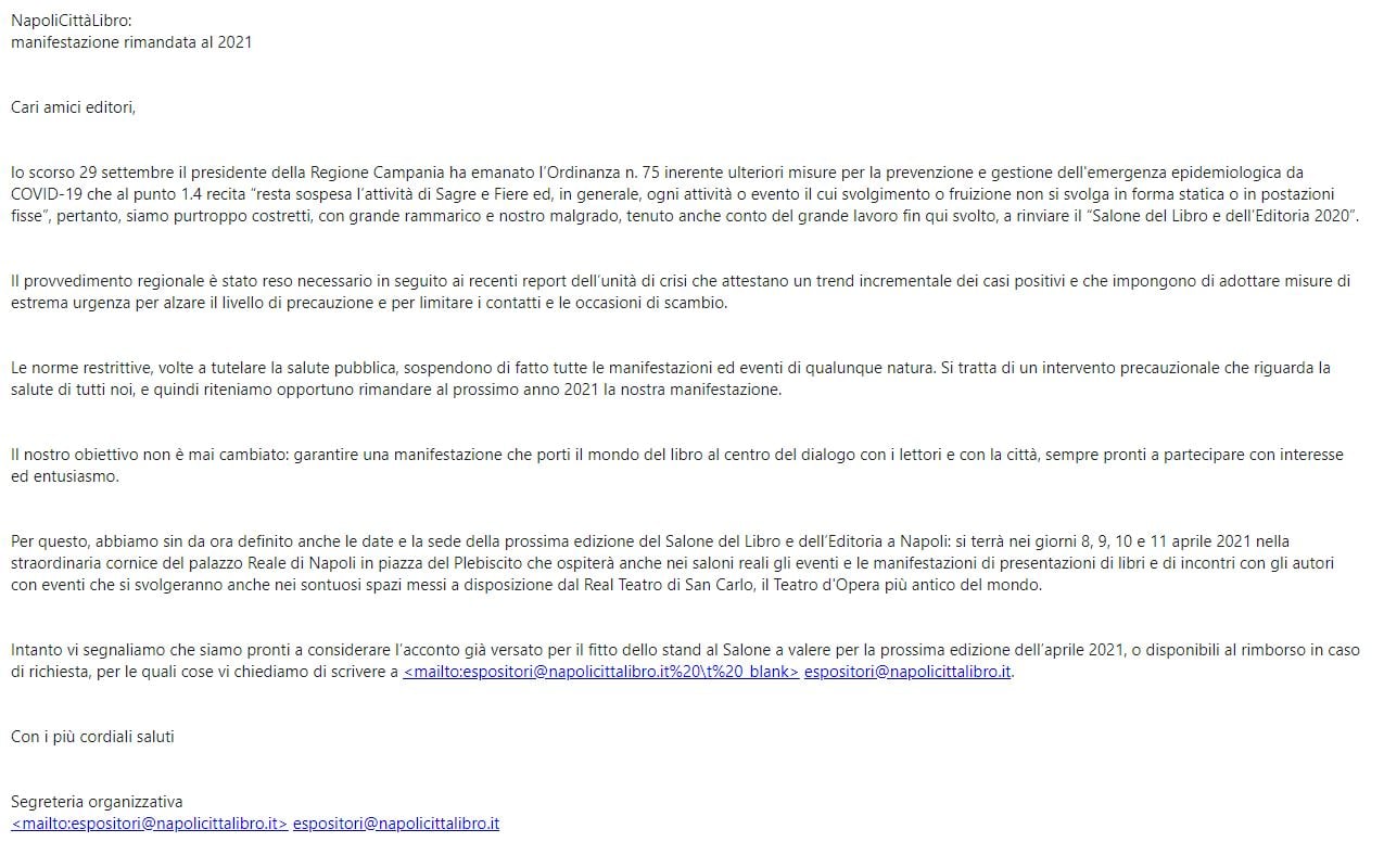Cultura Focus In evidenza “Napoli Città Libro”, manifestazione rimandata al 2021Redazione Desk-Ott 6, 2020 9:40La manifestazione “Napoli città Libro” è stata rimandata al 2021 a causa dell’emergenza Covid-19. Ecco il comunicato:
