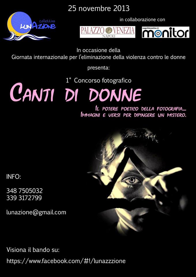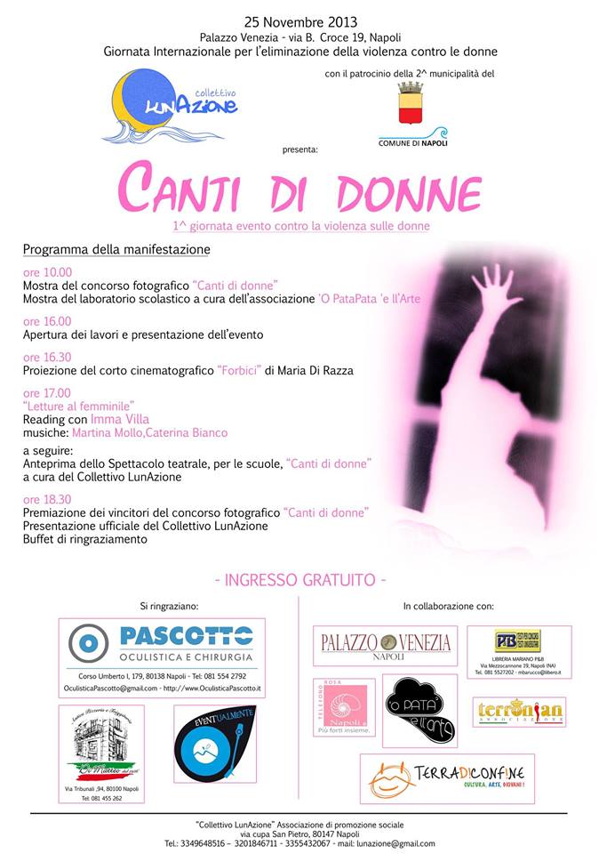 Il 25 novembre, all’interno di Palazzo Venezia, si terrà l’evento ”Canti di donne”, in occasione della Giornata Internazionale contro il femminicidio e la violenza sulle donne. L’evento è patrocinato dalla Seconda Municipalità del Comune di Napoli e promosso dall’associazione ”Collettivo LunAzione”. L’evento vuole sensibilizzare sul tema del femminicidio e lo farà con momenti di riflessione, ma anche con l’arte e lo spettacolo.