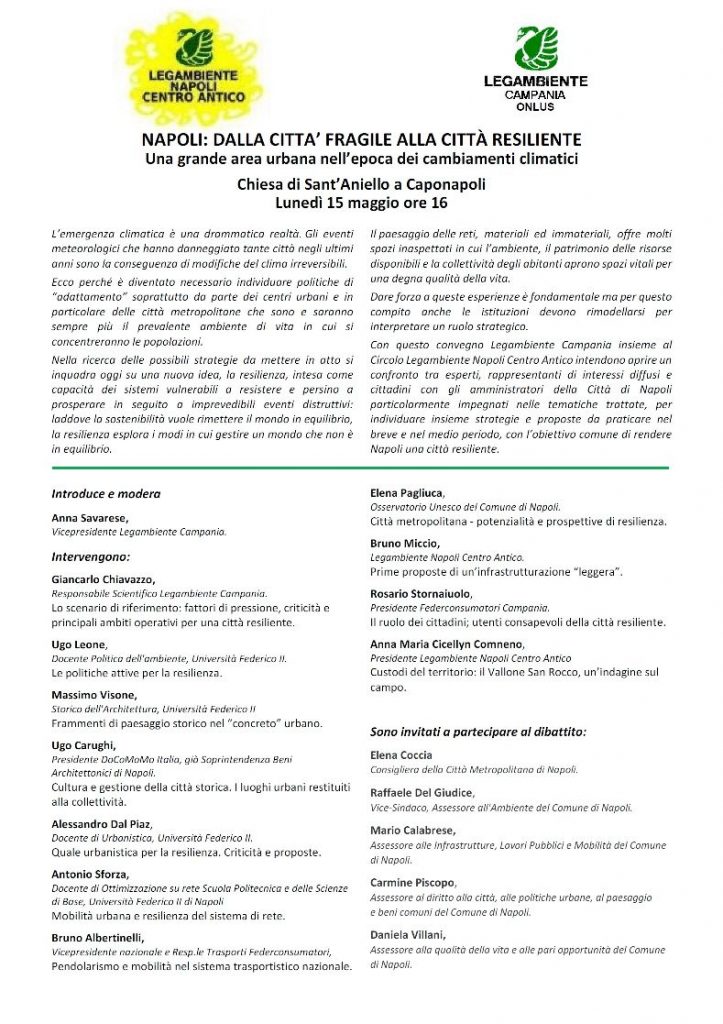Oggi, lunedì 15 maggio, ore 16, presso Chiesa di Sant’Aniello a Caponapoli, convegno Legambiente “Napoli: dalla città fragile alla città resiliente – Una grande area urbana nell’epoca dei cambiamenti climatici”.