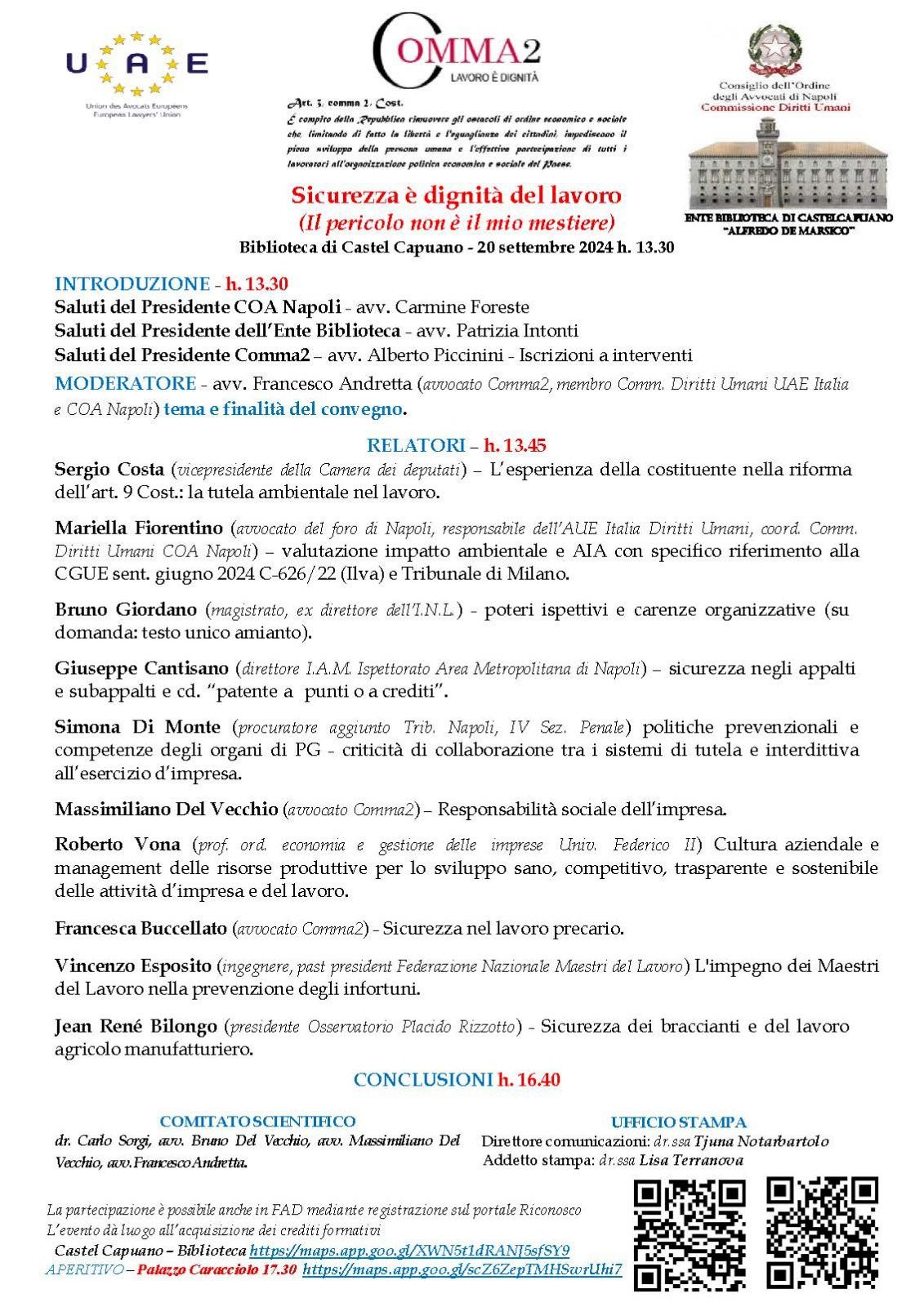 Mancano pochi giorni al convegno organizzato dall’associazione Comma2: “Sicurezza è dignità del lavoro” che si terrà venerdì 20 settembre dalle ore 13,30 presso la biblioteca di Castel Capuano. Tutti gli avvocati che parteciperanno potranno ottenere tre crediti formativi rilasciati dal COA di Napoli.