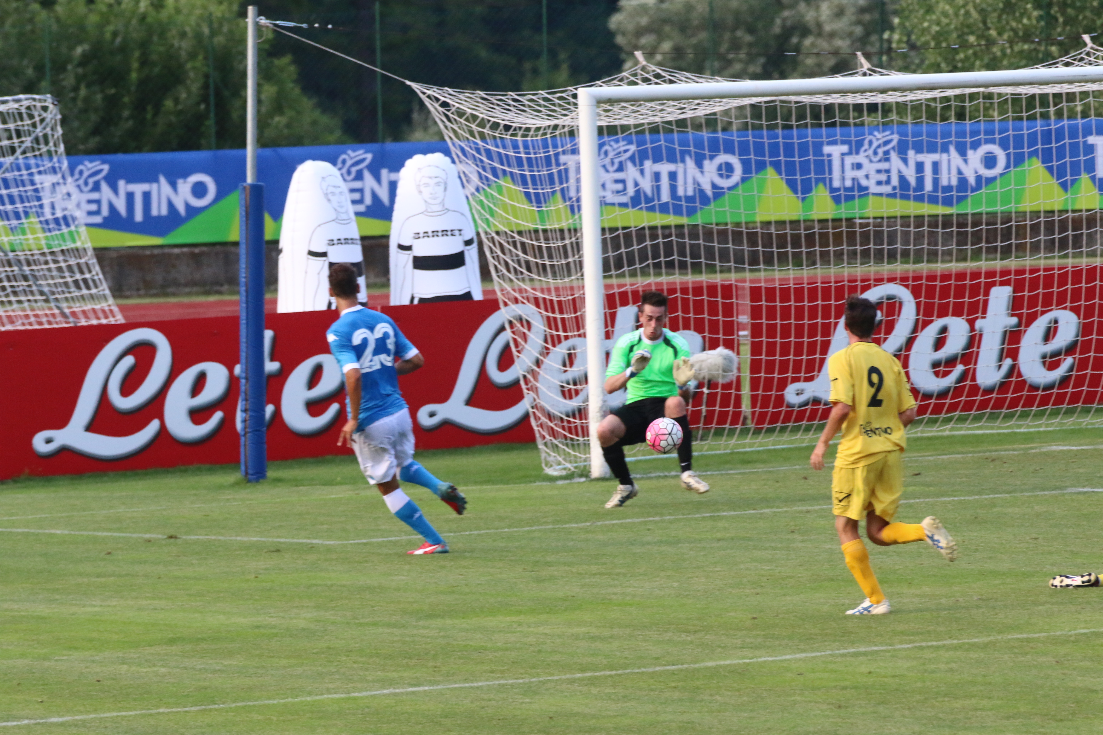 Pericolo per il Napoli (3′) con Panizza, che dalla trquarti propone una progressione e trova gli spazi d’inserimento giusti per intimidire la porta di Rafael. Bella soprapposizione di Maggio su Dezi, la palla finisce alta sulla traversa. Buone le chiusure del giovane Luperto che salva palle pericolose proposte dalla formazione trentina.