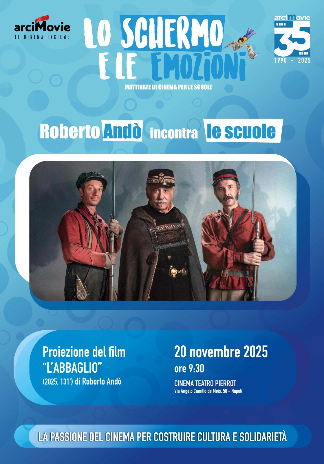 Torna “Lo schermo e le emozioni”, storica rassegna di cinema dell’associazione Arci Movie dedicata alle scuole che quest’anno arriva alla XXXIV edizione, ospitando Roberto Andò, grande artista di cinema, teatro e letteratura, che presenta il suo ultimo film “L’abbaglio”. Appuntamento per giovedì 20 novembre 2025 alle 9,30 al Cinema Pierrot di Ponticelli alla presenza di cinquecento studenti delle scuole della Campania.