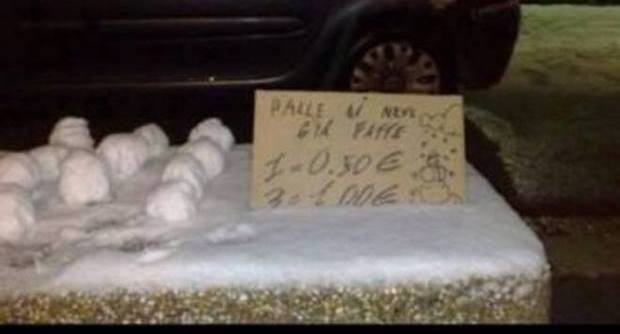 In tantissimi sui social network hanno pubblicato foto di una città ricoperta da uno strato di neve,e qualcuno si è divertito a vendere palle di neve su internet ed in strada. L’ ingegno napoletano ha superato se stesso. Molti ragazzini della provincia hanno iniziato un mercato delle palle di neve già fatte. 1 palla 50 centesimi, tre 1 euro. Un piccolo commercio che ha coinvolto molte persone divertiti da questa “iniziativa imprenditoriale”.