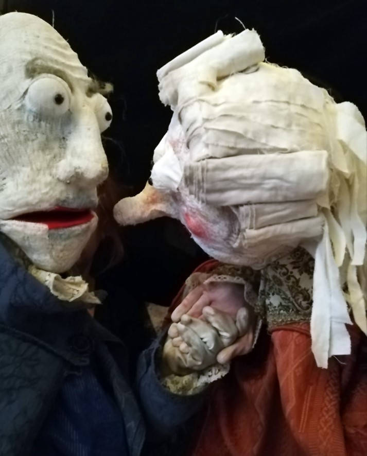 Evitando i rischi e le trappole di un realismo rappresentativo, l’opzione di un teatro di figura ha guidato Flavia D’Aiello nella creazione di pupazzi burattini per il testo di Puškin, trasferito in metafisica recita in cui, comunque, si ergono a colossi gli echi musicali del ”Don Giovanni” e del ”Requiem” mozartiano.