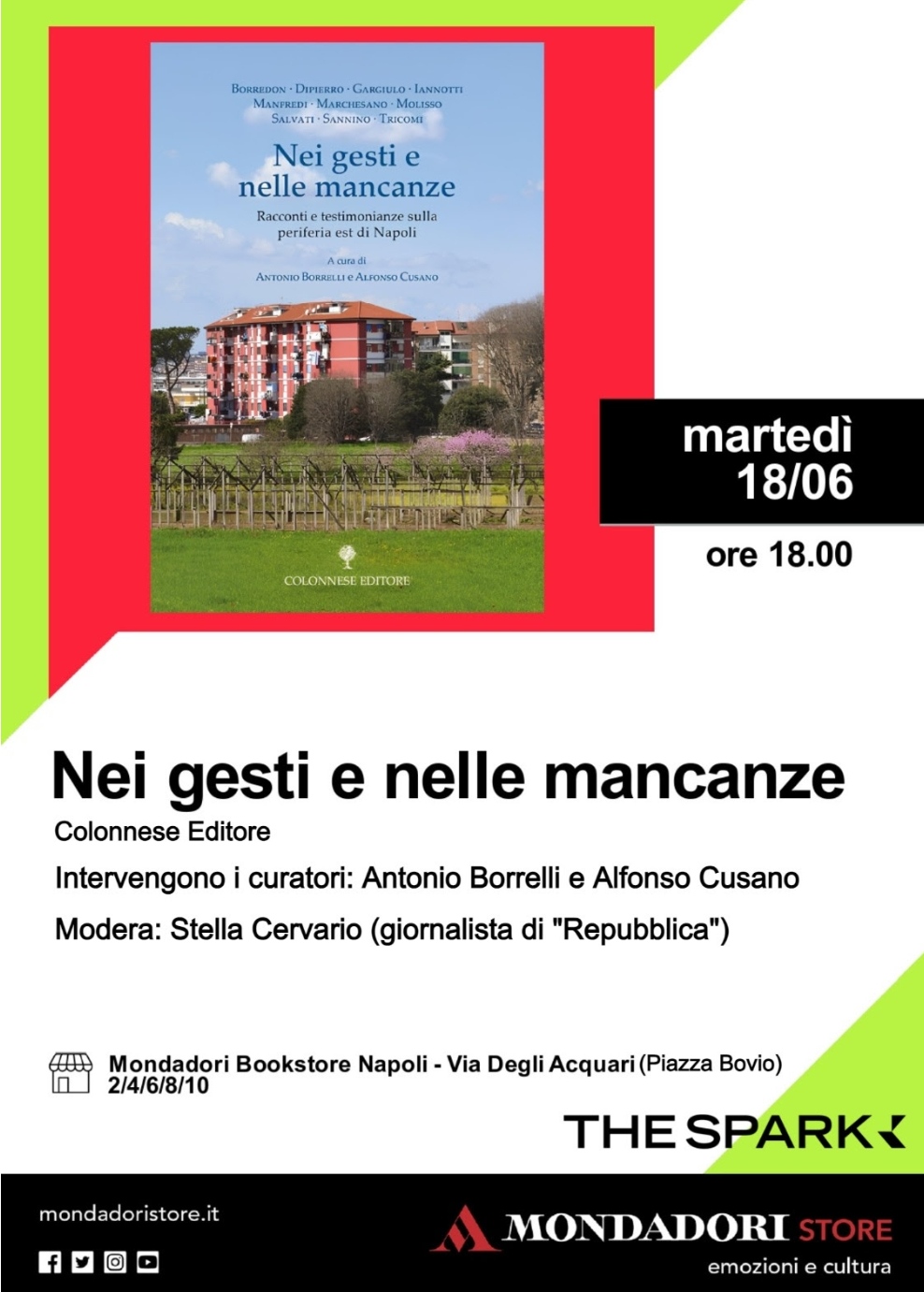 In libreria dal 22 aprile 2024, Nei gesti e nelle mancanze è un volume di racconti e testimonianze sulla periferia est di Napoli, a cura di Antonio Borrelli e Alfonso Cusano, con gli scritti di: Alberto Borredon, Decio Dipierro, Umberto Gargiulo, Maria Iannotti, Paola Manfredi, Nino Marchesano, Rossella Molisso, Antonio Salvati, fra Antonio Sannino e Antonio Tricomi.
