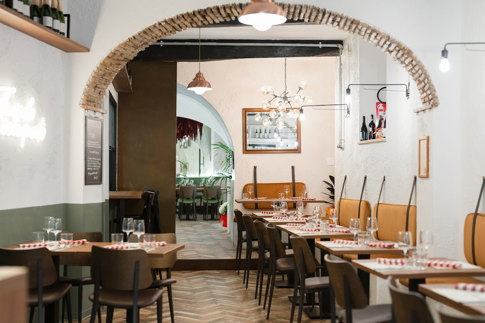 Lo stile estetico del locale sposa la proposta gastronomica, mantenendo la tradizione che però viene unita a materiali più moderni, dal finto cotto a terra fino alle pareti, tra mattonelle e muri volutamente vissuti. Passato e presente si incontrano, tra vecchie ricette della nonna, che qui possiamo trovare anche scritte a mano, e luci a led. Troviamo un’unica sala ma nell’immaginazione divisa in due zone per cui sono stati scelti due colori differenti, per 55 coperti interni circa e 25-30 nello spazio fuori, tra tavoli in legno e tovagliette di carta.