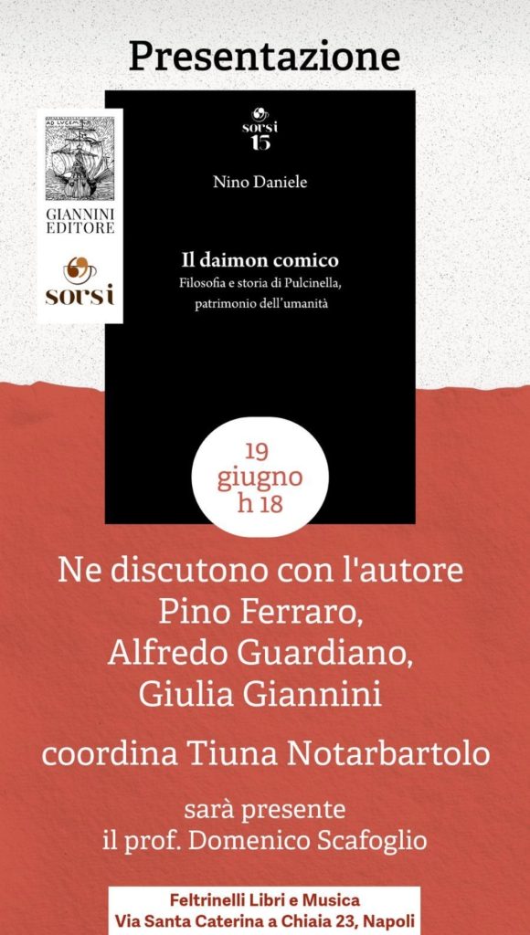 Un breve saggio sulla leggendaria figura di Pulcinella è l’ultimo lavoro di Nino Daniele: “Il daimon comico” verrà presentato al pubblico per la prima volta mercoledì 19 giugno alle ore 18 presso la libreria Feltrinelli di Piazza dei Martiri a Napoli.
