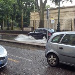 Ecco come si presenta la Riviera di Chiaia immediatamente dopo il forte temporale che si è abbattuto su tutta la città: fusti divelti dai vicini giardini della Villa Comunale che il vento ha trascinato in strada e carreggiata destinata un tempo al passaggio dei tram completamente allagata. Una volante della polizia municipale, come si può vedere dalle foto, è di pattuglia sul posto per evitare incidenti.