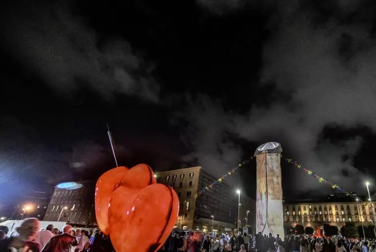 “La freccia nel cuore”, che rappresenta due cuori rossi, alti 5 metri, illuminati internamente e trafitti da una freccia metallica che li sostiene, è stata realizzata da Luca Bertozzi su disegno del maestro Pesce ed è di proprietà del Comune di Napoli. Da domani la scultura sarà collocata temporaneamente nel cortile del Castel Nuovo.