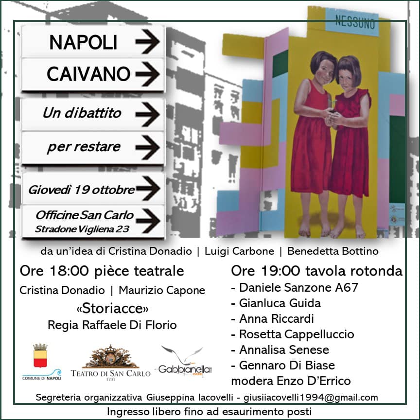 Giovedì 19 ottobre, a Officine San Carlo si terrà l’evento “Caivano-Napoli. Un dibattito per restare”, che ho organizzato in sinergia con l’attrice Cristina Donadio e l’organizzatrice Benedetta Bottino.