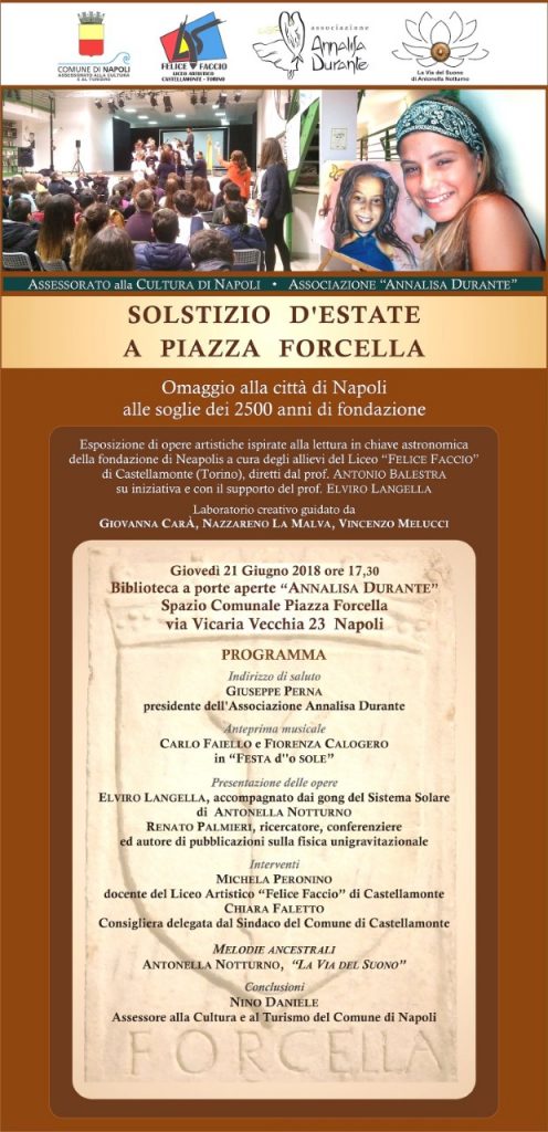 L’evento si terrà alle 17,30 presso la Biblioteca di via Vicaria Vecchia e costituirà un omaggio alla nostra città, fondata – secondo la teoria astronomica di Cicearco da Messina, ripresa dallo studioso napoletano Renato Palmieri – nel Solstizio d’inverno di 2.491 anni fa, come rimarcherà il prof. Elviro Langella, storico dell’arte, che insieme al direttore del Liceo artistico di Castellamonte (TO) prof. Antonio Balestra, presenterà le opere realizzate dagli allievi del liceo piemontese, ispirate alla luce del Solstizio che illuminò la fondazione di Neapolis.