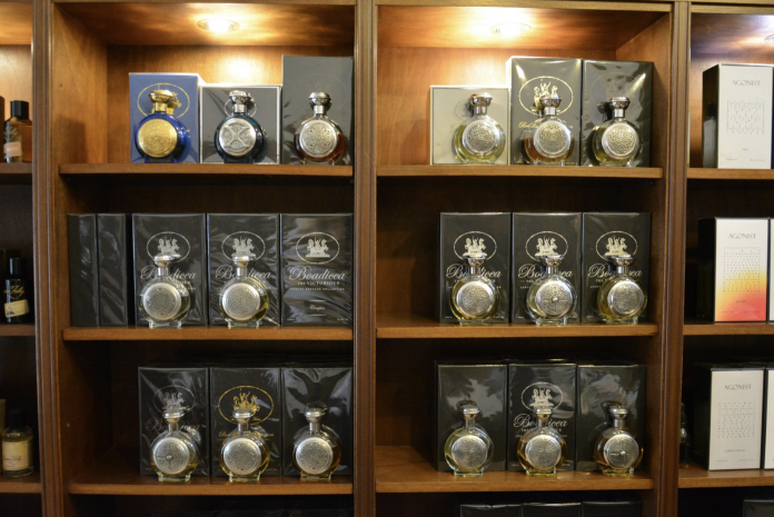 Su eleganti scaffali di legno pregiato sfilano, in elegante parata, profumi, creme, pomate e unguenti delle più raffinate case profumiere del mondo. L’introvabile Grossmith, Boadicea the Victorius, linea dedicata all’unica donna che abbia sconfitto le legioni romane; Aedes de Venustas, il tempio della bellezza dagli accordi insoliti, audaci, futuristi; Stephane Humbert Lucas dalle allucinate costruzioni olfattive. Come dicevamo prima, sono nomi poco conosciuti al pubblico assuefatto ai profumi più pubblicizzati dai media.