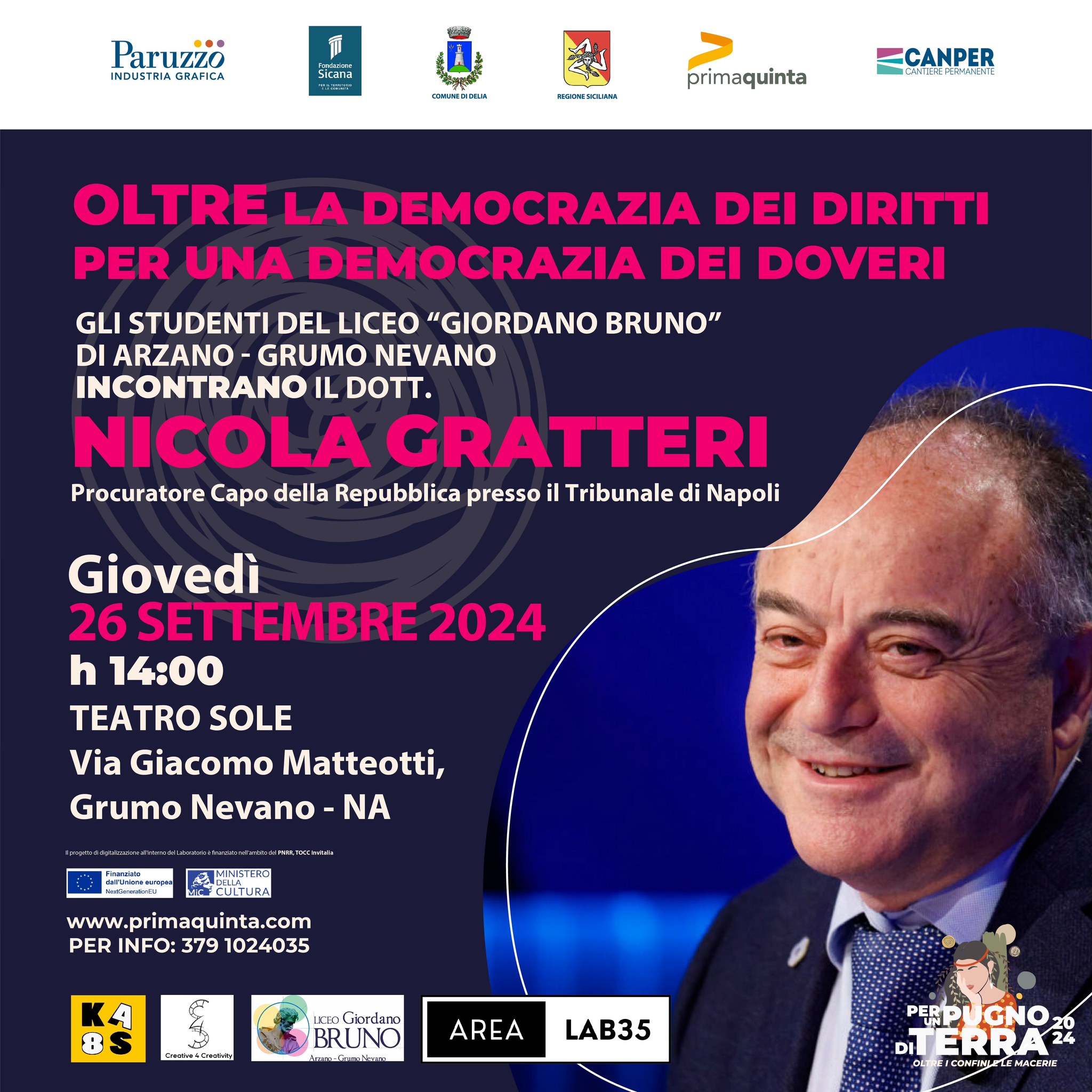 Infatti gli studenti del Liceo Giordano Bruno di Grumo Nevano ed Arzano incontreranno il Dott. Nicola Gratteri, Procuratore Capo della Repubblica presso il Tribunale di Napoli. L’incontro si terrà presso il Teatro Sole di Grumo Nevano alle ore 14.00. Un modo per confrontarsi con le tematiche del festival con un momento dal titolo “Oltre la democrazia dei diritti per una democrazia dei doveri”. Modererà l’incontro Giuseppe Rapè. Il Liceo Giordano Bruno di Grumo Nevano ed Arzano, con il coordinamento della DS Maria Luisa Buono, ha sposato immediatamente l’iniziativa per continuare il percorso educativo sulla cultura alla legalità come cammino da coltivare quotidianamente e tappa importante per i giovani cittadini.