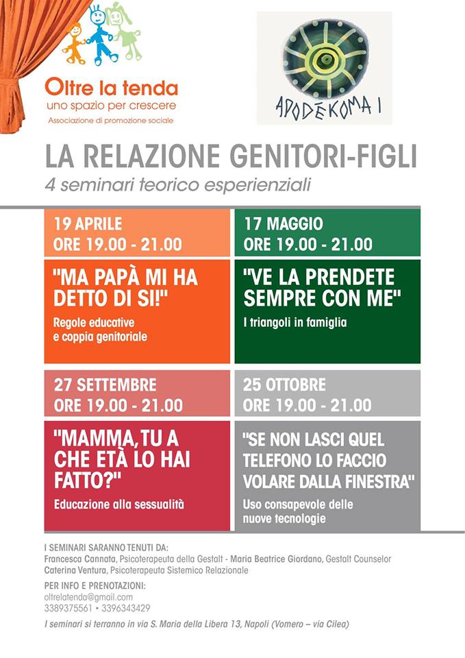 Giovedì 27 settembre 2018, dalle 19.00 alle 21.00 presso sede di Oltre la tenda in via Santa Maria della Libera 13 (Vomero – trav. via Cilea – metro 4 giornate) il terzo incontro del ciclo di seminari sulla relazione Genitori Figli organizzato in collaborazione con l’associazione Apodekomai sul tema dell’educazione alla sessualità.