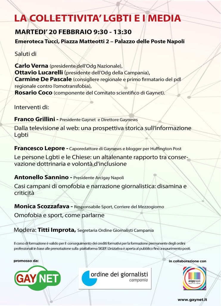 Esso si aprirà coi saluti di Carlo Verna (presidente dell’Odg Nazionale), Ottavio Lucarelli (presidente dell’Odg della Campania), Carmine De Pascale (consigliere regionale e primo firmatario del pdl regionale contro l’omotransfobia), Rosario Coco (componente del Comitato scientifico di Gaynet). Seguiranno le lezioni di Franco Grillini (direttore di Gaynews e presidente di Gaynet), Monica Scozzafava (responsabile Sport, Corriere del Mezzogiorno), Antonello Sannino (presidente Arcigay Napoli), Francesco Lepore (caporedattore di Gaynews e blogger per Huffington Post).