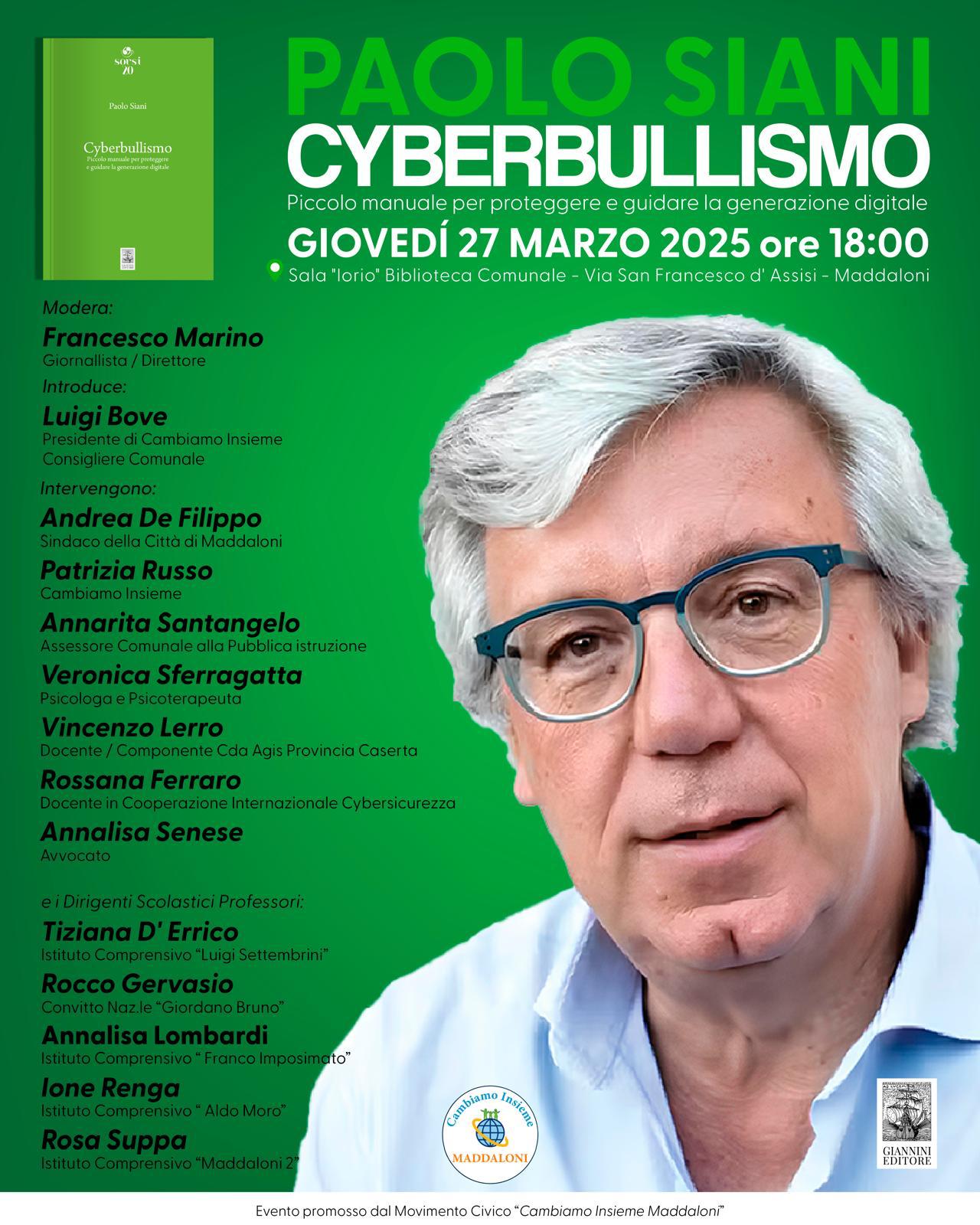 Verrà a presentato a Maddaloni in provincia di Caserta, il libro di Paolo Siani: “Cyberbullismo”, pubblicato dalla Giannini Editore nella nota collana Sorsi. L’evento si terrà giovedì 27 marzo presso la sala Iorio della biblioteca comunale, via San Francesco d’Assisi.
