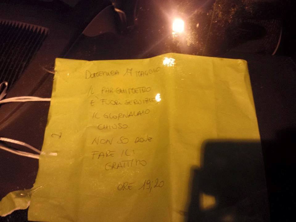 Domenica 17 maggio, alcuni cittadini, si sono visti costretti a lasciare un biglietto, visibile, all’interno della propria auto con la speranza di evitare multe che diventano sempre più salate. “Il parchimetro è fuori servizio, il giornalaio chiuso, non so dove fare il grattino. Ore 19.20“, questo è solo uno dei messaggi che hanno “arricchito” la sera di domenica 17 maggio.