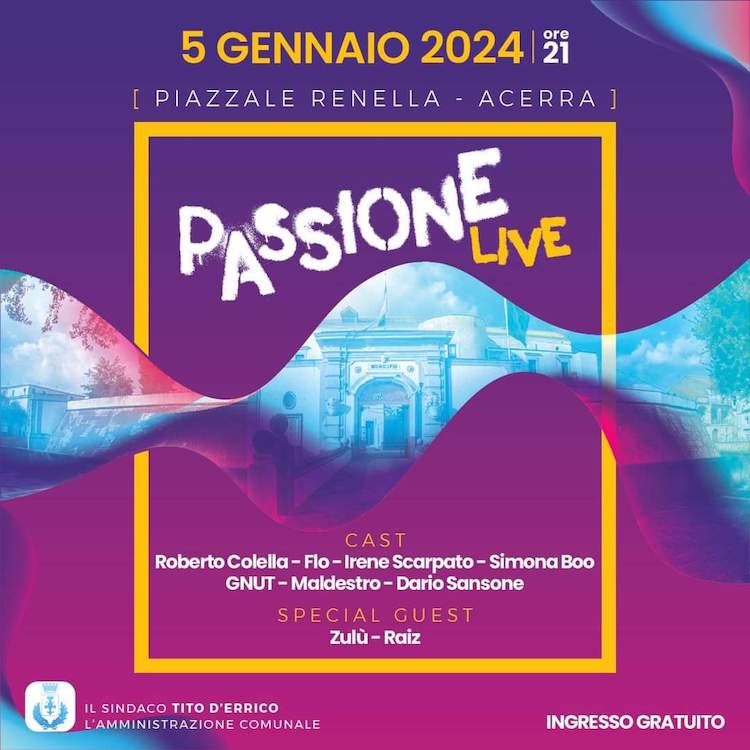 Venerdi 5 gennaio, presso Piazza Renella di Acerra (Na), alle ore 21.00 ad ingresso gratuito; di scena “Passione Live“, uno concerto al contempo moderno e tradizionale, capace di stupire ed emozionare. Lo spettacolo è un viaggio sensoriale capace di trasportare, metaforicamente, il pubblico nel cuore pulsante di una città senza tempo (Napoli); dove la musica è espressione e parte integrante di una cultura unica al mondo.