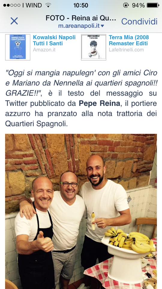 “Oggi si mangia napulegn’ con gli amici Ciro e Mariano da Nennella ai quartieri spagnoli!! GRAZIE!!”, è il testo del messaggio su Twitter pubblicato da Pepe Reina, che ha pranzato alla nota trattoria dei Quartieri Spagnoli. Pepe Reina sempre più candidato alla cittadinanza onoraria. Vedi la sua intervista dopo Napoli Bruges