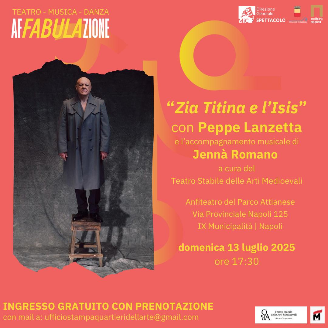 Zia Titina si confronta con l’Isis: il one-man show, una sorta di “Lenny Bruce napoletano”, ci offre dei graffiti narrativi sulla Napoli del tardo XX secolo e dei primi decenni del XXI. Ad accompagnare musicalmente Lanzetta nelle sue affascinanti favole contemporanee sarà il maestro Jennà Romano.