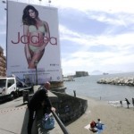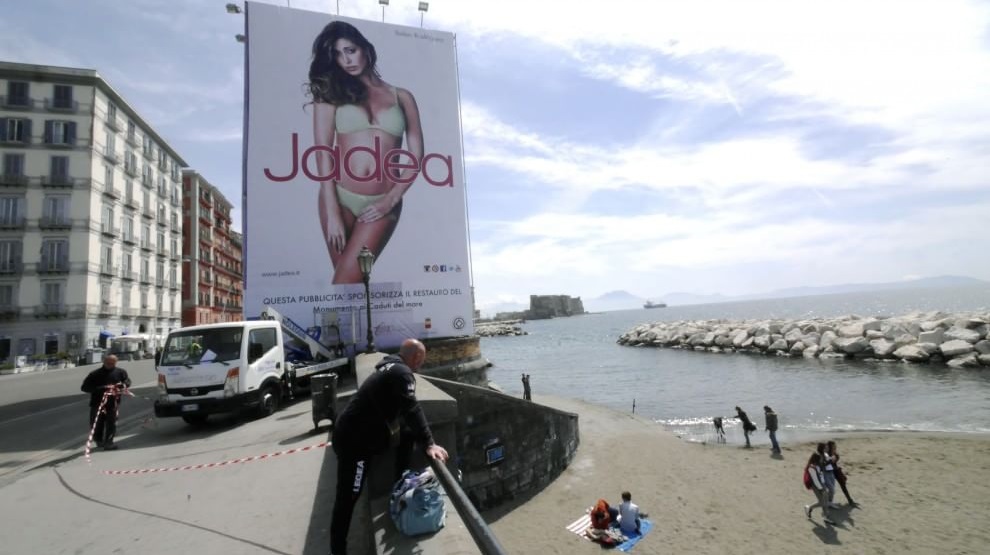 Infatti è proprio lì che, avvicinandosi, all’occhio del turista o del napoletano che deciderà, complici le belle giornate della primavera inoltrata, si ritroverà di fronte qualcosa di nuovo. Una pubblicità enorme, come si vede dalle foto di Riccardo Siano, apparse su Repubblica, della showgirl argentina, Belen Rodriguez, testimonial di una marca di intimo, sponsor, appunto, del restauro, a copertura totale non solo della Colonna, ma anche della vista che va al di là di questa. A farne le spese, ad esempio, il Castel dell’Ovo, che, per essere “ritrovato” dallo sguardo, deve faticare e non poco.