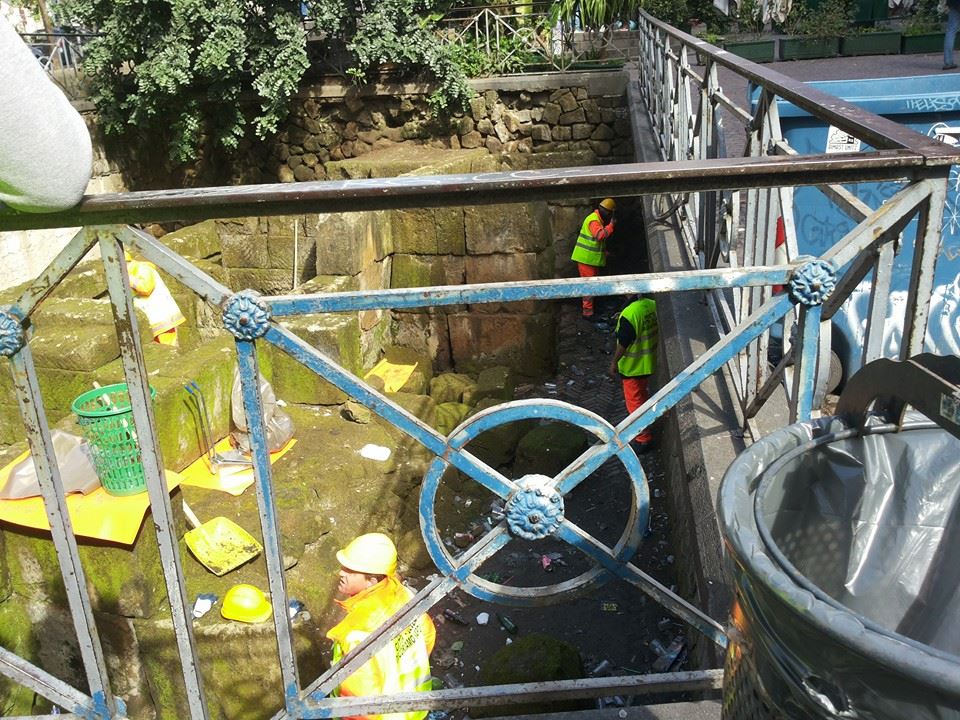 Sono iniziati questa mattina e andranno avanti ogni lunedì i lavori di pulizia delle mura greche di piazza Bellini, da tempo ormai ridotte a una discarica permanente.