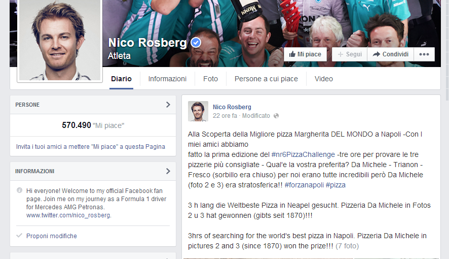 Il campione di Formula1 Nico Rosberg è arrivato a Napoli per una vacanza. Ieri con i suoi amici ha deciso di scoprire la vera pizza Margherita e incoronare la più buona. Michele, Trianon e Fresco sono le pizzerie che ha visitato in sole tre ore e per lui la pizza di Michele è “stratosferica!”