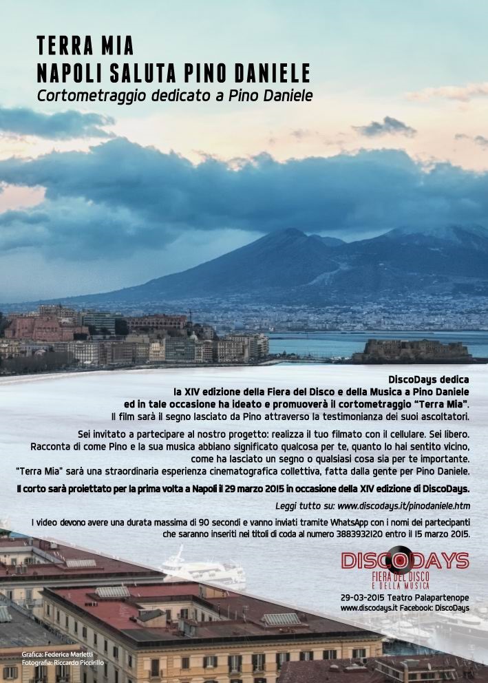 La prossima edizione della fiera annuale dedicata alla musica e ai dischi in vinile, la più importante del Sud Italia, sarà tutta dedicata a Pino Daniele e avrà luogo al Palapartenope di Napoli il 29 marzo dalle ore 10.00 alle ore 21.30. In tale occasione sarà proiettato un cortrometraggio, a cui tutti potranno partecipare, dal nome “Terra mia, Napoli saluta Pino Daniele“: il contrometraggio documentaristico collettivo è ideato e promosso da DiscoDays e sarà realizzato da Francesco Giglio con la supervisione di Flavio Gioia, coordinatore artistico. Chiunque voglia può prendere parte al progetto composto da pensieri, storie e ricordi di tutti i fan del grande cantautore partenopeo, testimonianze di quanto la musica di Pino Daniele abbia influenzato le nostre vite.
