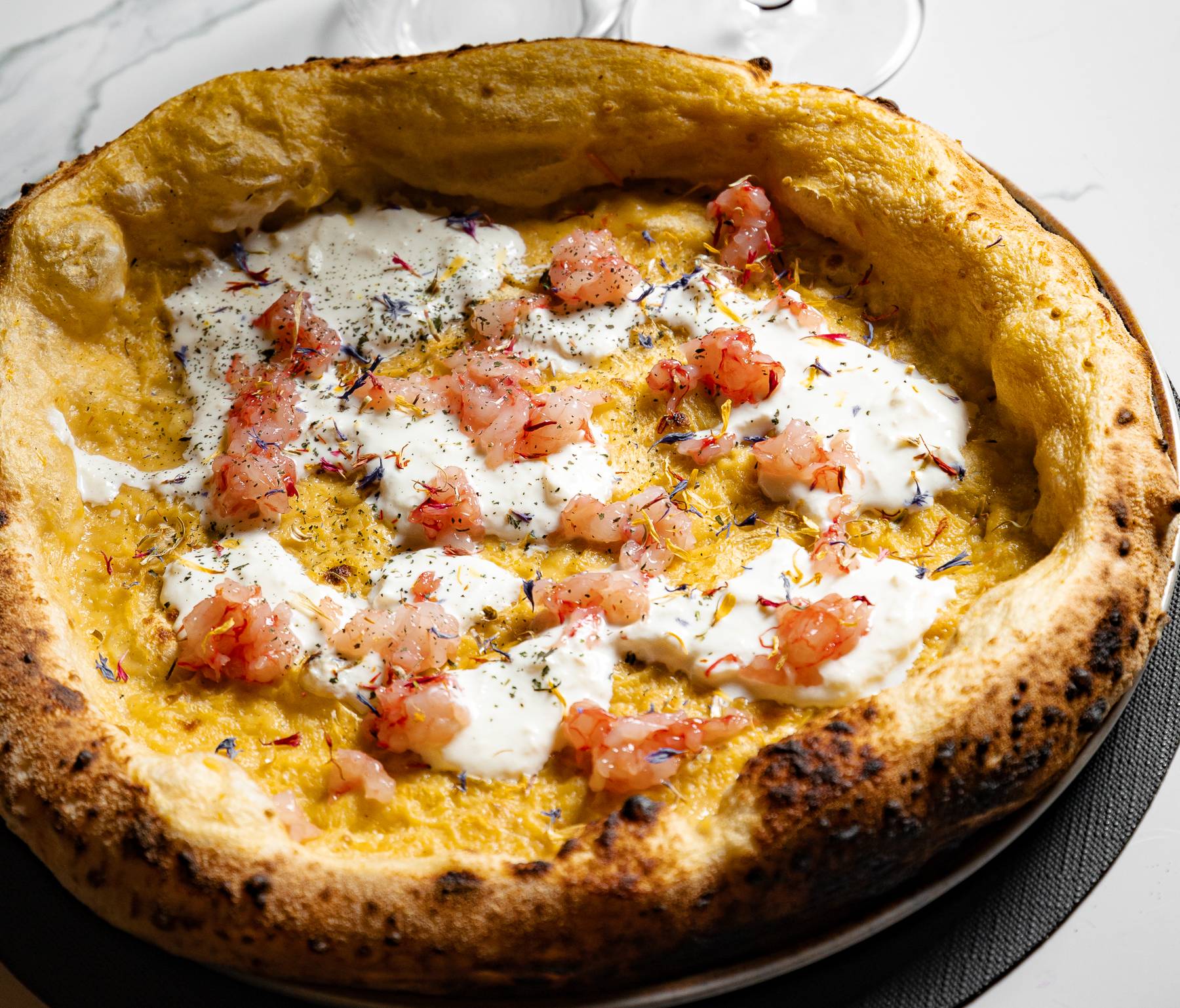 È una pizza napoletana in continua evoluzione, la pizza contemporanea “gambero fiorato” dall’Etna al Vesuvio, che omaggia la Campania e la Sicilia. Gli ingredienti sono uno tripudio di sapori: salsa di piennolo giallo del Vesuvio in cottura e in uscita stracciata di bufala campana D.O.P tartare di gambero rosso di Mazzara, buccia di limone di Sorrento, pepe nero, fiori edili commestibili; per concludere olio nocellara Etnea.