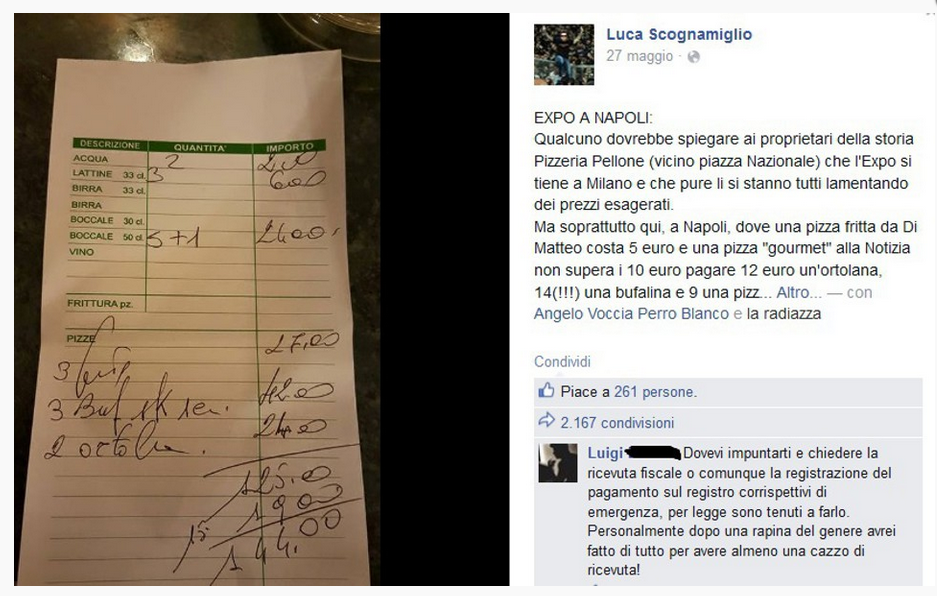 Il giovane Luca, pubblicando anche la foto dello “scontrino”, si lamenta per i prezzi ritenuti più vicini a quelli dell’Expo di Milano che a quelli delle pizzerie napoletane: