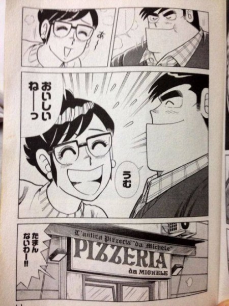 Il fumetto in questione è “Cooking Papa” di Tochi Ueyama, che racconta le vicissitudini di un impiegato-mago dei fornelli, che cucina in incognito deliziosi manicaretti lasciando credere a tutti che sia la moglie a prepararli. In uno degli episodi del manga, Tochi Ueyama ha riprodotto l’inconfondibile insegna della pizzeria “Da Michele” fin nei minimi dettagli: non c’è dubbio che i protagonisti si trovino a Napoli, e che stiano gustando proprio una delle due deliziose pizze che è possibile assaggiare nello storico locale, aperto dal 1870: margherita e marinara.