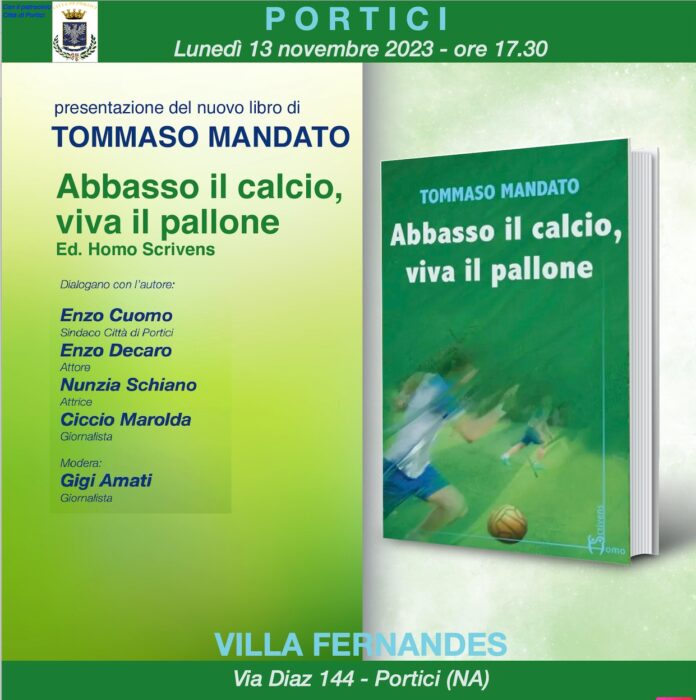 Oggi, lunedì 13 novembre, presso Villa Fernandes, in Via Armando Diaz, 144, 80055 Portici NA, Italia, si terrà la presentazione del nuovo libro di Tommaso Mandato ‘Abbasso il calcio, viva il pallone’ ed. Homo Scrivens.