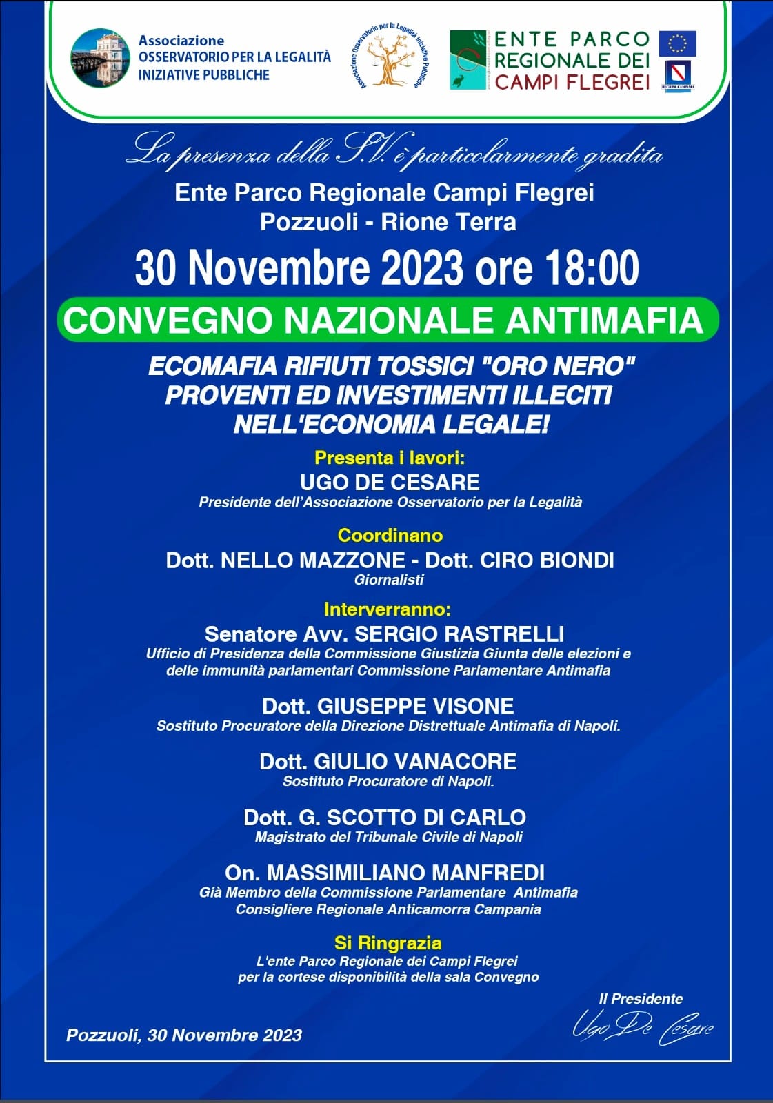 “Ecomafie, rifiuti tossici, mafie”. Si terrà giovedì 30 novembre – alle ore 18 – il Convegno Nazionale Antimafia organizzato dall’Associazione Osservatorio per la Legalità – Iniziative Pubbliche” presieduta da Ugo De Cesare.