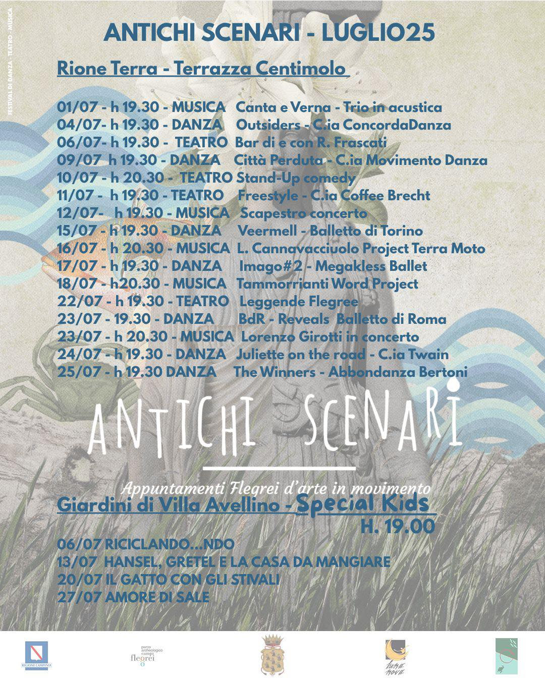 Il programma di luglio è già in pieno svolgimento, con Antichi scenari – Appuntamenti flegrei d’arte in movimento, una rassegna che fino al 25 luglio porterà oltre 20 compagnie artistiche in scena tra il Rione Terra, la Terrazza Centimolo e Villa Avellino.