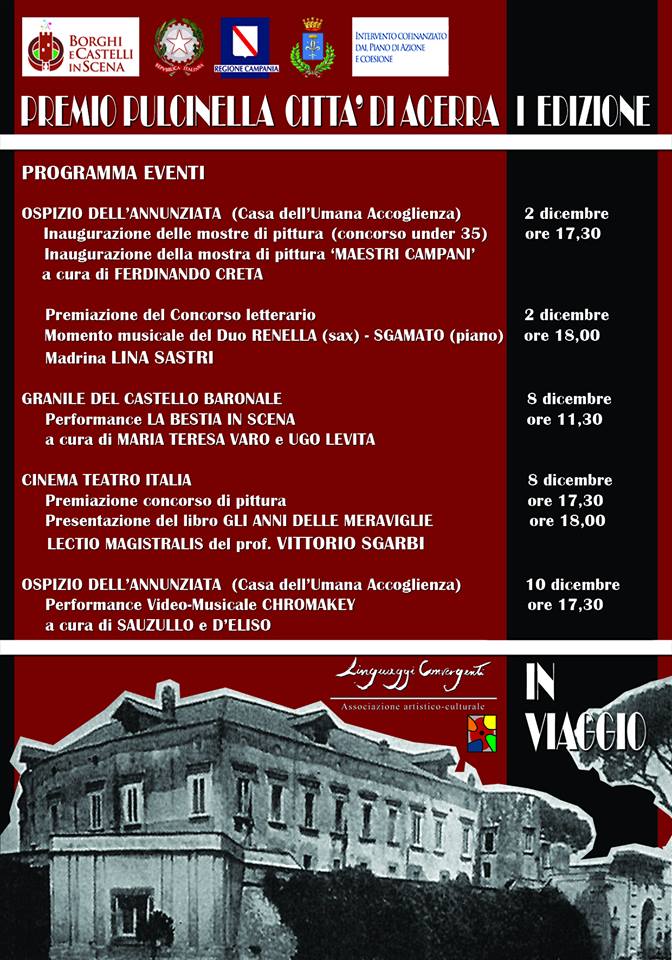 Nell’ambito della manifestazione regionale ‘Borghi e Castelli in scena’, l’associazione artistico culturale “Linguaggi Convergenti” promotrice del Premio Pulcinella città di Acerra, in collaborazione col comune di Acerra, comunica le date degli eventi previsti nel comune della città metropolitana di Napoli, dal 2 al 10 Dicembre 2015.